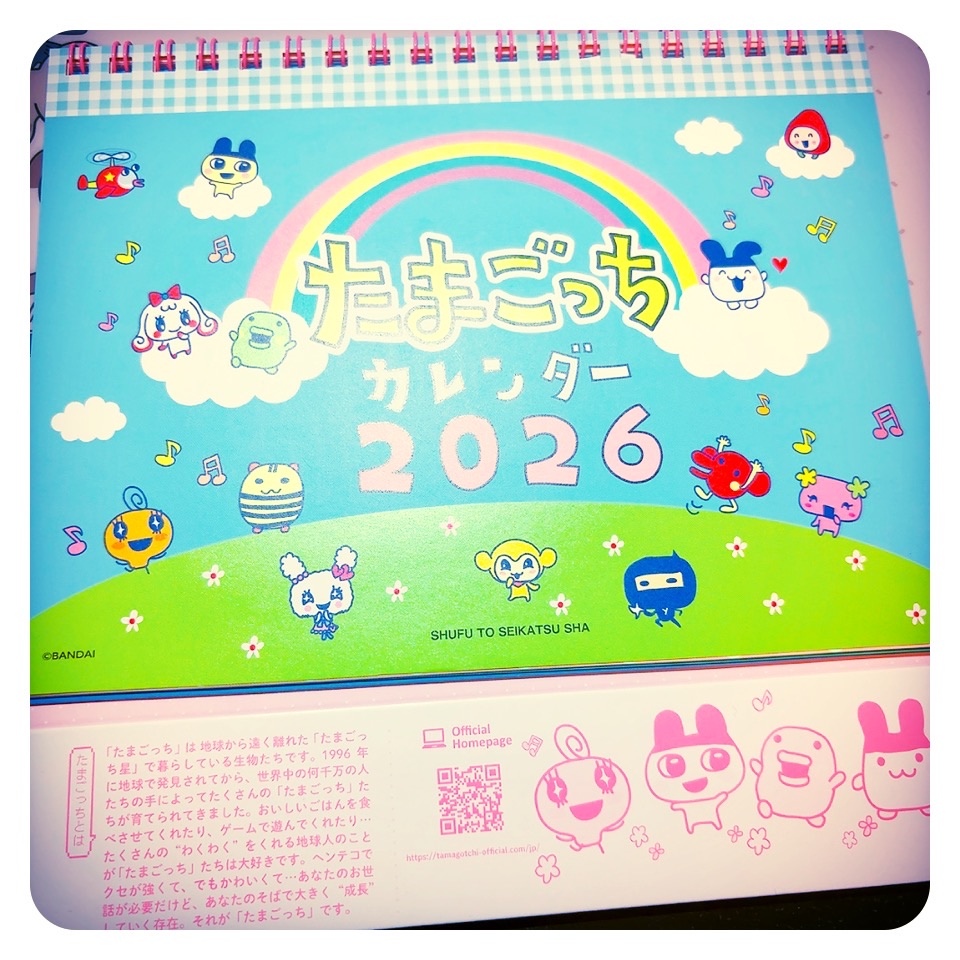 2026年のカレンダー 11月の中旬くらいかな?ふらっと立ち寄った本屋さんで偶然見つけたんです。出てるって知らなかったから、ビックリしたしすごくうれしかったー!というわけで、今年はたまごっちの皆といっしょだよ(^O^)